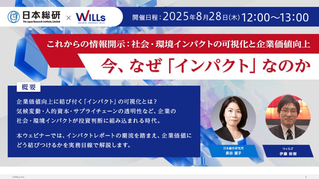 【セミナーレポート】日本総研×ウィルズ 共催IRオンラインセミナー【これからの情報開示:社会・環境インパクトの可視化と企業価値向上】〜今、なぜ「インパクト」なのか〜