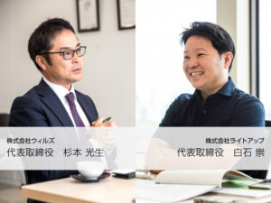 株式会社ライトアップ代表取締役社長 白石崇氏 3/3 2020 10/14 インタビュー 2018年9月20日2020年10月14日 Tweet Pocket 会社名:株式会社ライトアップ (証券コード:6580) 代表者:代表取締役社長 白石 崇(しらいし たかし) 略 歴:1997年に筑波大学第二学群人間学類を卒業後、1997年に日本電信電話株式会社に入社。NTT東日本上野支店法人営業部、株式会社ぷららネットワークなどを歴任。2001年に株式会社サイバーエージェントに入社しコンテンツ部門の立ち上げ責任者を歴任後、2002年にライトアップを設立する。 所在地:東京都渋谷区渋谷二丁目15番1号 渋谷クロスタワー32階 設 立:2002年4月5日 事 業:中小企業の生産性向上のためのITツール導入支援などを中心としたコンサルティング業務およびWebコンテンツの制作 資本金:3憶8,638万円 URL:https://www.writeup.jp/ ライトアップは、2002年に元サイバーエージェント社コンテンツ部門メンバーが中心になり設立され、当初は様々な企業の「メールマガジン」の編集代行を手掛け、その後、「メルマガ」→「ブログ」→「バズマーケ」→「ソーシャルマーケ」→「SEO」→「クラウドツール」→「経営支援」・・・と業態の拡大と転換を繰り返しながら、現在は第18期を迎えました。「受託制作業務」「クラウドツール開発卸業務」「全く新しい新規事業業務」の3つにバランスよく取り組み、全国、全ての中小企業を黒字にするそのために、「世の中が望むサービスを全力で提供し続けていく」をモットーに、あらゆるネット系新規事業にチャレンジし続けています。 目次これからのライトアップ 杉本:上場してプライベートカンパニーからパブリックカンパニーになるわけですけれども、会社として成長への期待値が出てくると思います。今の市場領域だと素人目に見て、マーケットポテンシャルのアップサイドにどこかで問題が想像されるかと思うのですが、どのような成長ストーリーを描いているんでしょうか。 白石:そういう考えもありますが、上場企業を相手にビジネスをするのと非上場の中小企業相手にビジネスをする、という違いはなかなかに大きいです。中小企業数、約380万社というマーケットのうち、社員数5名未満の小規模事業者は320万社で、1社から30万円まで頂ける関係で、毎年2,000社の取引があり、それが2年間以上続いています。狙っているマーケットに対するサービスの妥当性はある程度証明できているかなと思います。大手企業と取引をしたい会社はいくらでもあって、完全レッドオーシャンだと思います。一方、赤字の中小企業300万社はブルーオーシャン。一長一短だと思います。 杉本:380万社あると違いますね。これだけの市場規模ですと、多くの優秀な人材が必要だと思いますが、御社は人材について、どのような教育方針や思想方法を使っているのでしょうか。 白石:弊社は社員数100名になったばかりの会社です。採用方法としてはいろいろと試しましたが、現在はJエンジンでも取り扱っている採用サービスとリファラル採用ですね。弊社は離職率が低く10%もありません。長く勤めている社員が多く、在籍年数的な厚みがあるんだと思います。価値観がある程度整っているとか、変な人がいないとか、そういうところに強みがあるのだと思います。研修に関しても、少人数なので私自身がある程度面倒を見ることができます。また、入社半年以内の社員とランチをとりながら弊社17年の歴史を伝えたり、新規事業提案の機会を月2回用意したりと、施策を5,6個ぐらい運用しています。 杉本:離職率が低いのは優位性だと思うのですが、その理由は何でしょうか? 白石:全社員にアンケートをとって、希望するキャリア像を丁寧に確認しています。将来グループ会社のトップを目指したいのか、あるいは係長のままでいいのか、相手のライフスタイルや価値観に合わせた支援や研修サポートを行っています。やる気のある若手には積極的に研修に出席させたり、ビジネスに関して事細かく説明したりといった貴重な機会を提供します。 杉本:ビジネスに対しても社員に対しても、押し付けるのではなくて相手のスタイルに合わせるということなんですね。 白石:昭和が終わって平成も終わるという時代に、全員で上を目指そうというのは難しいと思います。高度経済成長も終わって、前は10頑張れば15もらえたものが、今は10頑張っても5しかもらえない状況です。それなら一人一人の希望に合わせることで、みんなを幸せにするしかないと考えています。 杉本:投資家向けにお聞きしますが、資金使途についてどのようなお考えがありますか? 白石:コンサルタントをロボットにしようと考えています。今は人が動いているため30万円かかっていますが、これが全自動になれば将来的に無料で経営コンサルを提供できます。弊社の利益も重要ですが、お客様の利益を優先して考えています。赤字の中小企業の経営者が無料で経営コンサルティングを受けられるような環境を作れば、日本は活性化すると思う